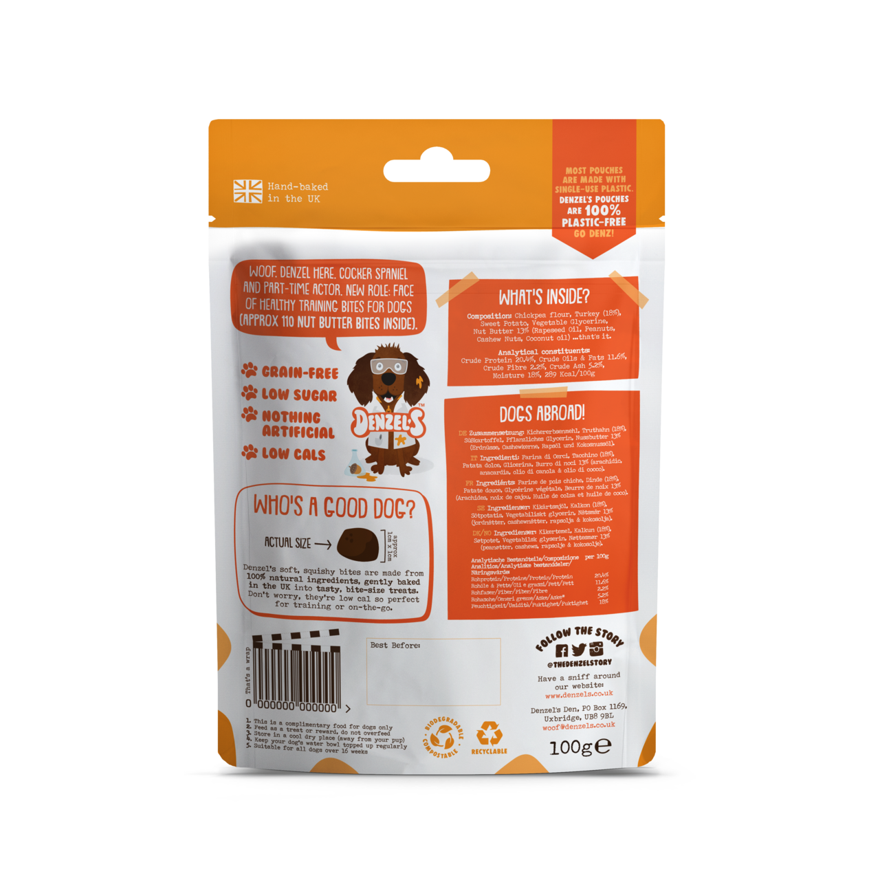 Denzel's soft, squishy bites are made from 100% natural ingredients, gently baked in the UK into tasty, bite-size treats. Don't worry they're low cal so perfect for training or on-the-go.