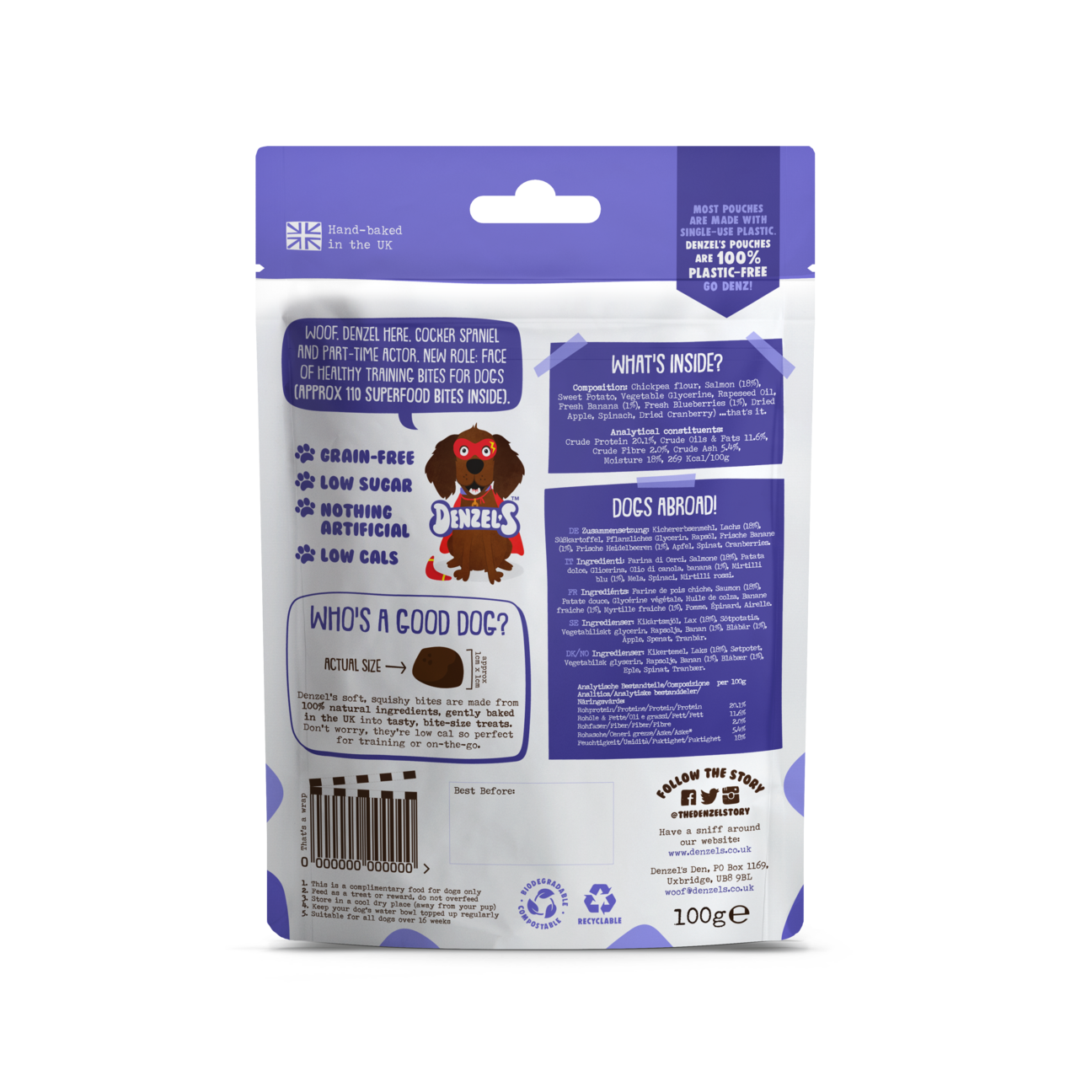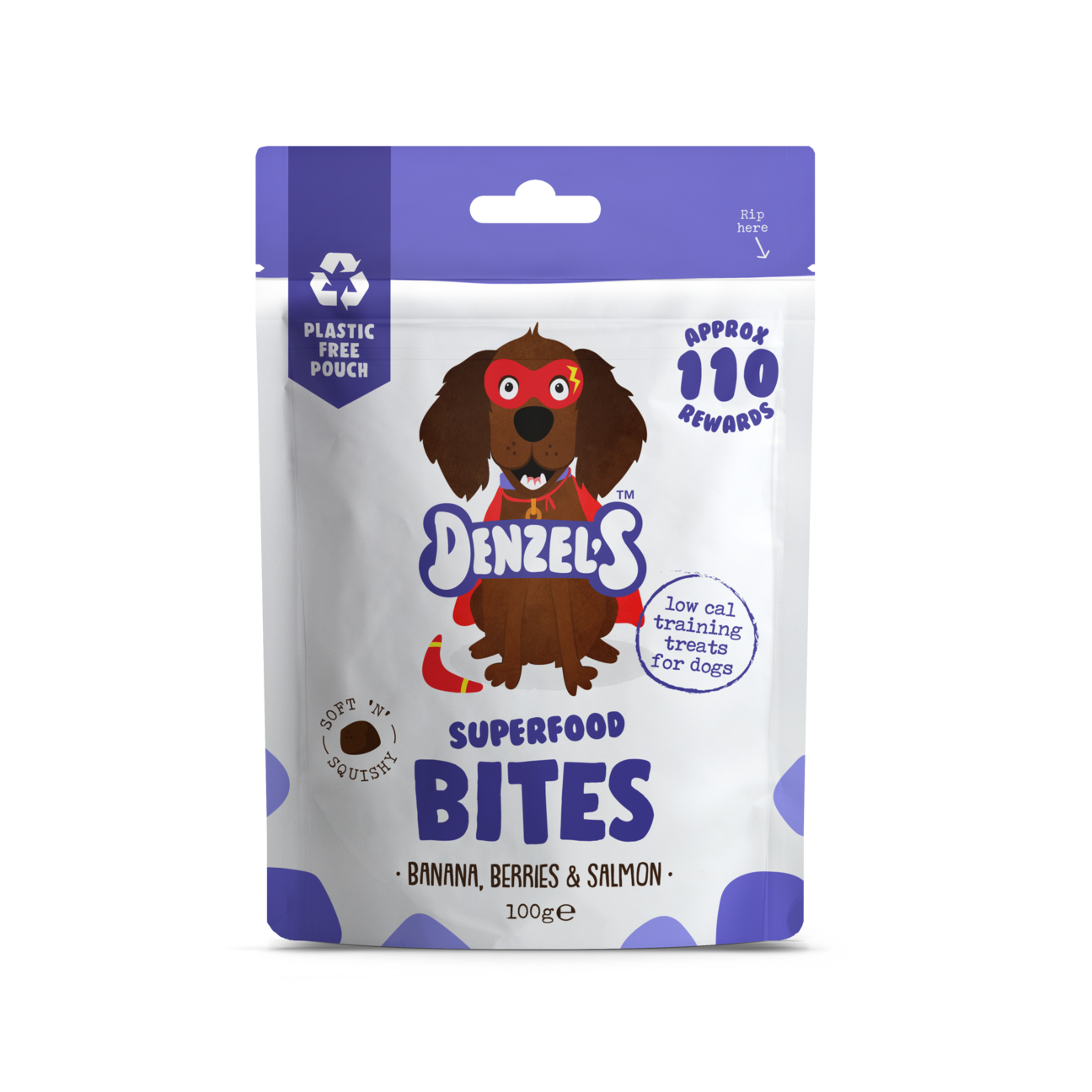 Denzel's soft, squishy bites are made from 100% natural ingredients, gently baked in the UK into tasty, bite-size treats. Don't worry they're low cal so perfect for training or on-the-go.