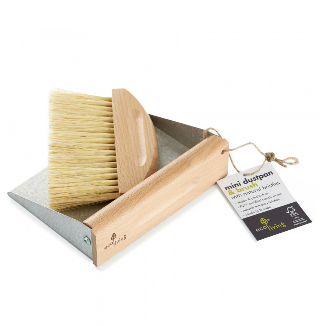 A mini dustpan set. Ideal for sweeping crumbs from a table or surfaces. This mini dustpan and brush set is made of FSC® certified beech wood and long natural vegan tampico bristles with a steel pan. The brush has a handle magnet to connect with the pan for easy storage.